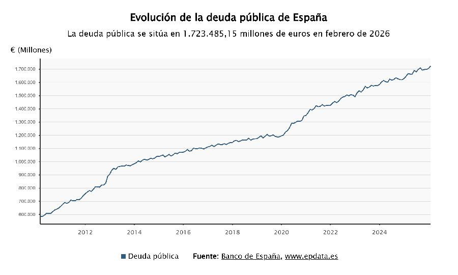 Con estos crecimientos registrados en este segundo mes del año, el dato de febrero supera el máximo histórico alcanzado en septiembre, cuando la deuda se situó en 1,709 billones de euros.
