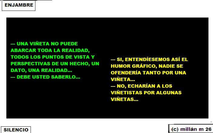 - Viene como noticia, no pondré su nombre, para no perjudicarla, que en ARCO una pintora de un país de Asia, no diré tampoco el nombre de dicha sociedad, ha expuesto una serie de pinturas, que podemos estar de acuerdo o en desacuerdo, pero que expresa que en su sociedad-país por esos cuadros estaría condenada a muerte. Por lo cual es claro y evidente, que jamás podrá volver a su sociedad. Uno, cree que ya una pintura o un dibujo o una fotografía, o el arte plástico, ya no llevan a la muerte. Pero parece ser que sí.