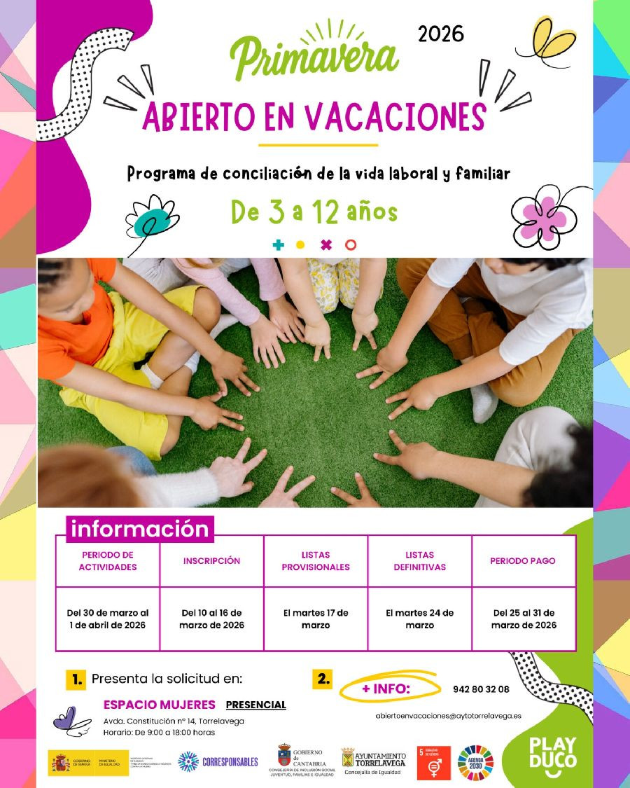 Torrelavega abrirá del 10 al 16 de marzo el plazo de solicitud de plaza para participar en el programa municipal de conciliación `Abierto en Vacaciones Primavera 2026`, dirigido a niños de entre 3 y 12 años que estén empadronados en el municipio, y que se prestará del 30 de marzo al 1 de abril, ambos inclusive.