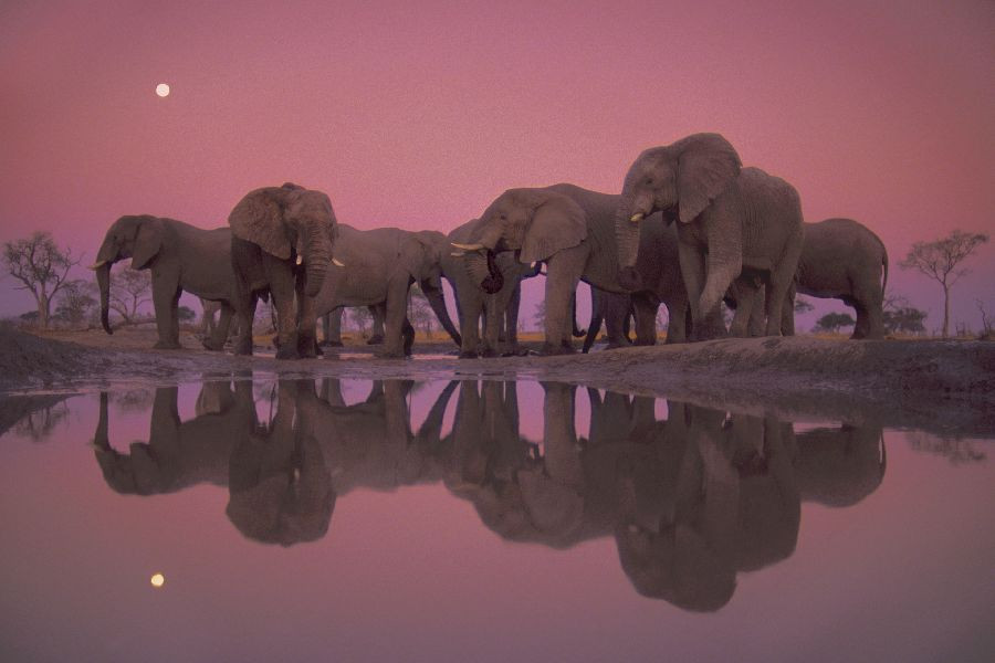 Así, en las imágenes se pueden ver escenas y animales como un orrangután trepando por un árbol en la región de la Sonda (Borneo, Asia), elefantes en una poza del Parque Nacional de Chobe (Botsuana, África) o el leopardo de las nieves en Parque Nacional de Hemis (India, Asia).